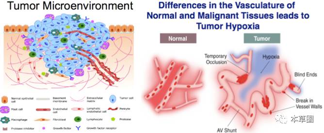 肿瘤微环境(TME)中的基质有三大类:血管生成血管细胞(AVC),浸润免疫细胞(IIC)和癌相关的成纤维细胞(CAF)。肿瘤细胞负责着基质细胞的募集、活化、编程和维持。肿瘤微环境在理化性质方面与人体正常内环境存在着许多不同的地方,比较显着的是其低氧、低PH以及高压的特点。