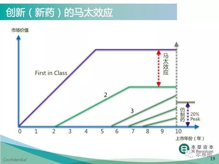 同样都是新药,为什么有的可以获得市场的巨大成功,有的不那么成功?这是因为创新一般具有马太效应,即强者愈强、弱者愈弱的两级分化现象。新药同样具有创新的马太效应。医药项目是基于科学和商业的双重考量:科学的可行性体现在药理、毒理、药动药代、生产工艺和临床药效等方面;商业价值则体现在理论市场空间,时间市场空间,竞争品种、定价空间和产品定位等方面。与首创药物相比,上市越晚,风险越大。上市前同机制已有药物越多,风险越大。典型的案例如“伟哥”系列药物:PDE-5抑制剂,第一个伟哥1998年上市,到现在全球一共有26个申请过临床批件,其中正式批下来的有5个,伟哥是第一个。26个临床中,到现在有8个已经终止,中国还有5个在临床。 Pfizer的Sildenafil(即伟哥)是First-in-Class药物,于1998年被批准上市。Lilly的Tadalafil(Cialis)则是真正意义上的me-better药物,具有更好的选择性和安全性,于2003年批准上市。但是5年的上市时间差使得具有更好性能的Tadalafil在2013年,上市后的第10年才在销售额上追平第一个上市的Sildenafil。这样的案例很多,正是因为这样,国外很多大公司发现自己的品种如果不在竞赛的第一阵营里就会deprioritize一些项目,而目前中国的很多公司完全不考虑这个因素。其实新药研发不应是为了创新而创新,做没有市场的创新药,还不如做仿制药。